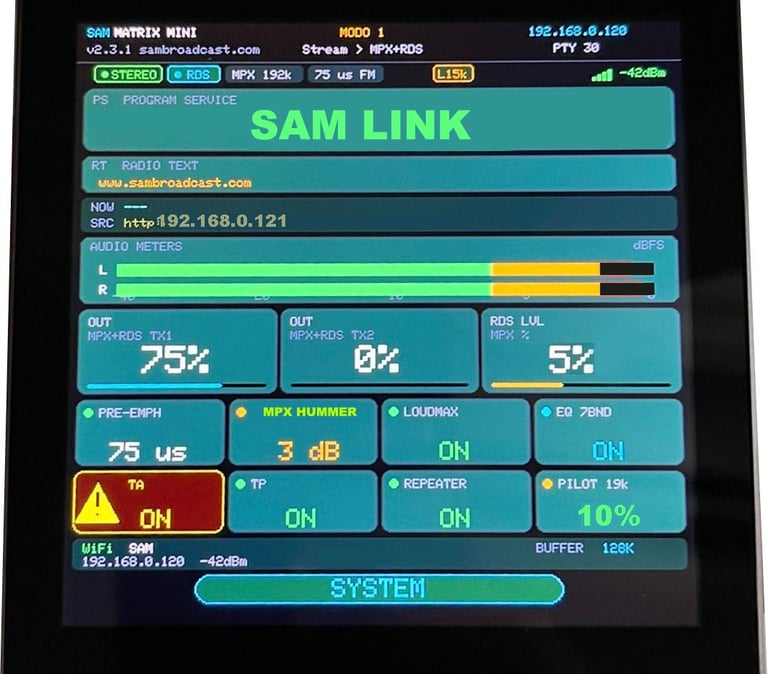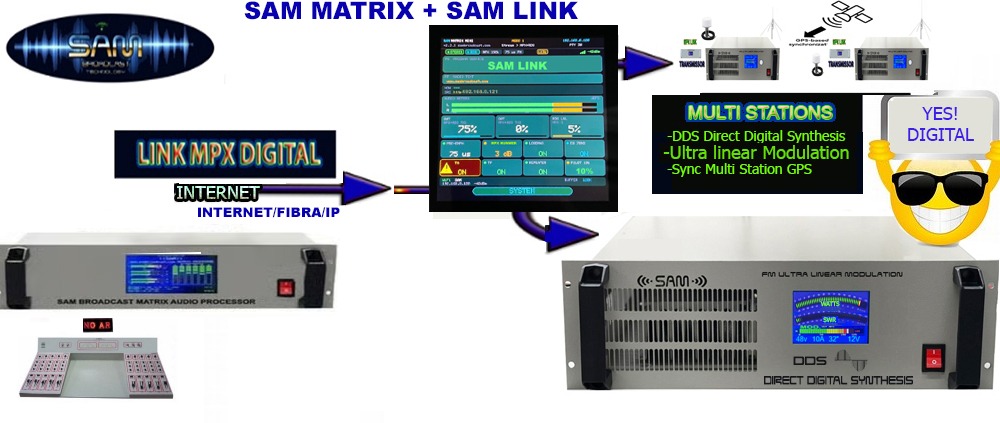 NO AR! Matrix FM/WEB . O processamento é totalmente digital 24 bits e sem atraso perceptível no FM (SAÍDA MPX LOW DELAY). Cada banda passa por inúmeras etapas, destacando: gates, compressores, limitadores, equalizadores, crossovers, módulo " Real Bass" graves Consistentes,módulo "Real voice " melhor nitidez na voz ,e o "PLASMA TUBE" a ponte entre a precisão digital e o caráter quente e vibrante dos efeitos baseados em válvulas analógicas, filtros Fir, de-esser... e dezenas de outros núcleos exclusivos SAM. Para o FM adicionado o poderoso MPX HUMMER pós processamento DSB MPX com e STEREO ENHANCER ajustável. Modulação precisa e com presença notável no dial, dentro dos padrões Legais. Tudo isso é executado em uma única plataforma e software otimizado por inteligência artificial. Não utiliza Windows,garantindo um sistema confiável e estável, livre de bugs e travamentos, incomparável robustez... sem fontes chaveadas, sem erros de inicialização por quedas de enegia.(deixe de ser refém dos "técnicos") Sistema de RDS rt+ e RDS REPEATER !