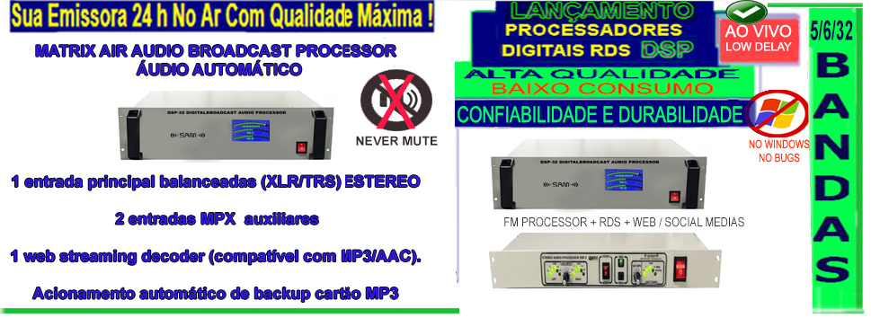 Transmissor FM SAM Broadcast Technology Equipamentos Rádio Comunitária Transmissores de FM 25 watts 50 100 150 300 1kw LINK MALETA PARA REPORTAGEM EXTERNA DE CAMPO TRANSMISSÃO ESPORTIVA CHAVE HIBRIDA CNPJ: 07.892.908/0001-04 Av. Júlio de castilhos, 783 - CENTRO - Veranópolis - RS Cep:95.330-000 54-996617132