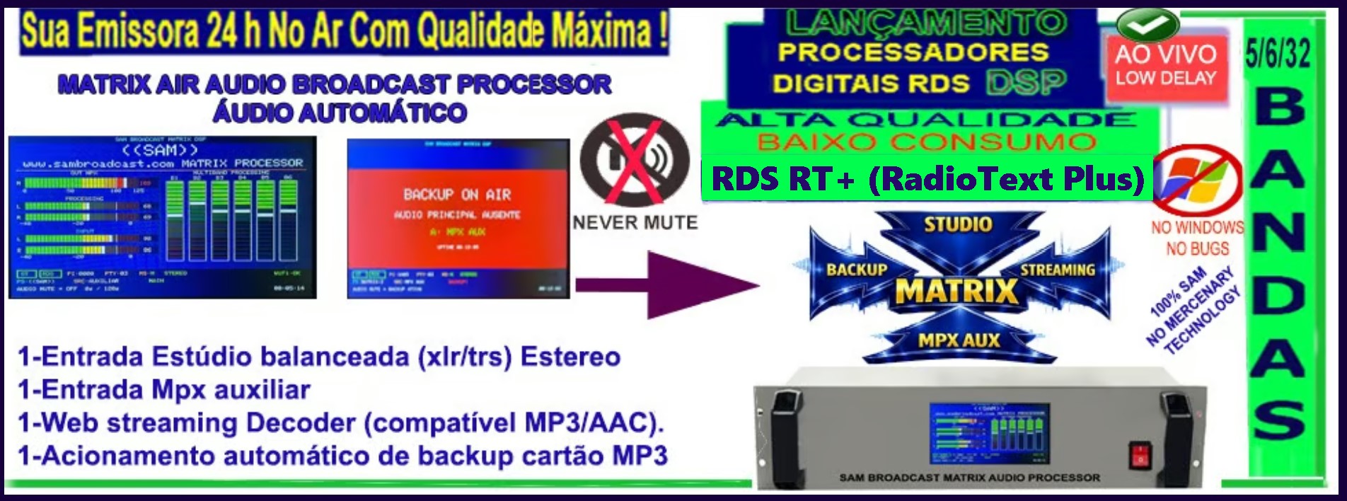NO AR! DSP-5IA com 5 bandas e DSP-32IA com 32 bandas. O processamento é totalmente digital, com 24 bits e sem atraso perceptível no FM. Cada banda passa por inúmeras etapas, destacando: gates, compressores, limitadores, equalizadores, crossovers," Real Bass" graves Consistentes, "Real voice " melhor nitidez na voz , DP-32 núcleo adicionado:"PLASMA TUBE" a ponte entre a precisão digital e o caráter quente e vibrante dos efeitos baseados em válvulas analógicas, filtros Fir, de-esser... e dezenas de outros núcleos exclusivos SAM. Para o FM adicionado poderoso mais um núcleo de pós processamento DSB MPX com gerador de STEREO DIGITAL ...Modulação precisa e com presença notável no dial, mas dentro dos padrões Legais. Tudo isso é executado em uma única plataforma e software otimizado por inteligência artificial. Os parâmetros utilizados levam em consideração a psicoacústica, som claro, harmonioso, agradável ao ouvido, soando mais natural ao ouvinte com menor saturação possível a fim de manter a audiência. Não utiliza Windows garantindo um sistema confiável e estável, livre de bugs e travamentos, incomparável robustez... sem fontes chaveadas, sem erros de inicialização por quedas de enegia.(deixe de ser refém dos "técnicos") Sistema de RDS PARA EXIBIÇÃO DE NOME DA EMISSORA,FRASES, NOME DE MÚSICAS....