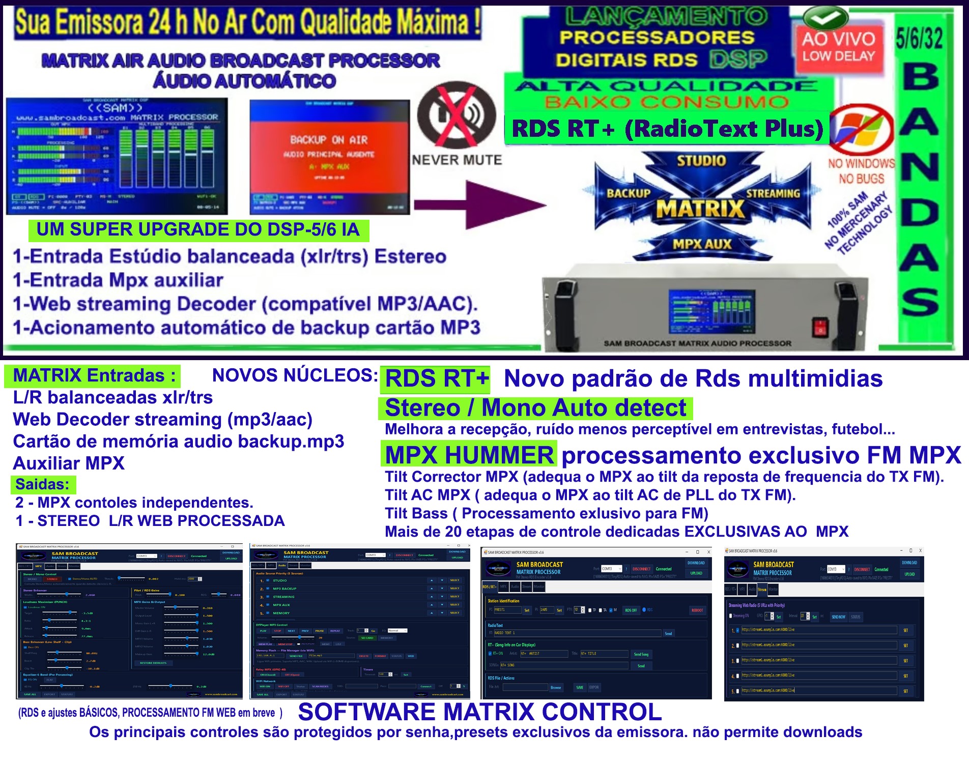 NO AR! DSP-5IA com 5 bandas e DSP-32IA com 32 bandas. O processamento é totalmente digital, com 24 bits e sem atraso perceptível no FM. Cada banda passa por inúmeras etapas, destacando: gates, compressores, limitadores, equalizadores, crossovers," Real Bass" graves Consistentes, "Real voice " melhor nitidez na voz , DP-32 núcleo adicionado:"PLASMA TUBE" a ponte entre a precisão digital e o caráter quente e vibrante dos efeitos baseados em válvulas analógicas, filtros Fir, de-esser... e dezenas de outros núcleos exclusivos SAM. Para o FM adicionado poderoso mais um núcleo de pós processamento DSB MPX com gerador de STEREO DIGITAL ...Modulação precisa e com presença notável no dial, mas dentro dos padrões Legais. Tudo isso é executado em uma única plataforma e software otimizado por inteligência artificial. Os parâmetros utilizados levam em consideração a psicoacústica, som claro, harmonioso, agradável ao ouvido, soando mais natural ao ouvinte com menor saturação possível a fim de manter a audiência.
