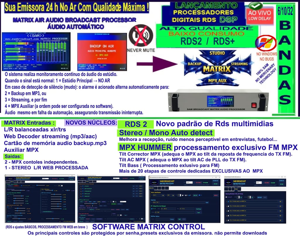 NO AR! Matrix FM/WEB DSP-32. e Matrix FM/WEB DSP-5. O processamento é totalmente digital, com 24 bits e sem atraso perceptível no FM. Cada banda passa por inúmeras etapas, destacando: gates, compressores, limitadores, equalizadores, crossovers," Real Bass" graves Consistentes, "Real voice " melhor nitidez na voz , DP-32 núcleo adicionado:"PLASMA TUBE" a ponte entre a precisão digital e o caráter quente e vibrante dos efeitos baseados em válvulas analógicas, filtros Fir, de-esser... e dezenas de outros núcleos exclusivos SAM. Para o FM adicionado poderoso mais um núcleo de pós processamento DSB MPX com gerador de STEREO DIGITAL ...Modulação precisa e com presença notável no dial, mas dentro dos padrões Legais. Tudo isso é executado em uma única plataforma e software otimizado por inteligência artificial. Os parâmetros utilizados levam em consideração a psicoacústica, som claro, harmonioso, agradável ao ouvido, soando mais natural ao ouvinte com menor saturação possível a fim de manter a audiência.